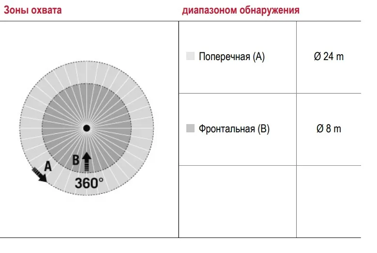 | диапазоном обнаружения Фронтально | Ø 8 м |