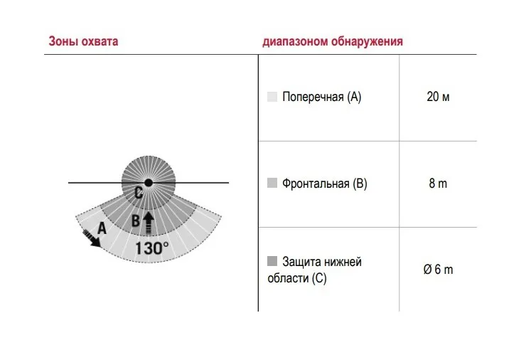 | Угол обнаружения | 130° + защита нижней области обнаружения 360° |