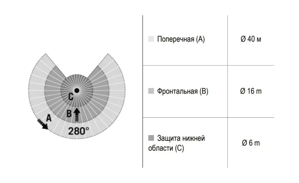Угол обнаружения Защита нижней области обнаружения 280° (3 x 95° регулируются отдельно) и 360°