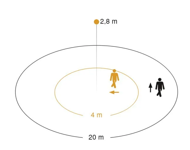 На больших площадях, многоэтажных автостоянках и производственных зданиях с высотой потолков до 4м не будешь ставить датчики каждый метр. В таких условиях требуются детекторы движения с большим радиусом действия. Как IS 3360. Он обнаруживает любое тангенциальное движение в радиусе 20 метров. Устанавливается даже на высоте до 4 метров. Вкратце: один IS 3360 покрывает площадь более 1000м²! STEINEL Инфракрасная технология, сдерживающая свои обещания.
