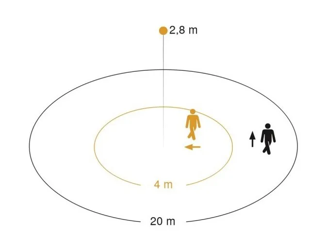 На больших площадях, многоэтажных автостоянках и производственных зданиях с высотой потолков до 4м не будешь ставить датчики каждый метр. В таких условиях требуются детекторы движения с большим радиусом действия. Как IS 3360. Он обнаруживает любое тангенциальное движение в радиусе 20 метров. Устанавливается даже на высоте до 4 метров. Вкратце: один IS 3360 покрывает площадь более 1000м²! STEINEL Инфракрасная технология, сдерживающая свои обещания.