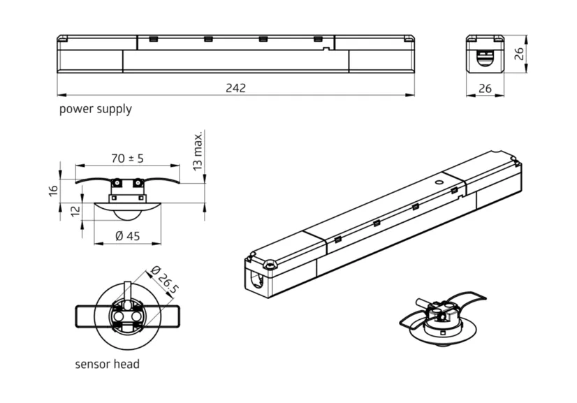 Размеры: Головка датчика: Ø 45 x 28 мм, блок питания: 240 x 26 x 26 мм