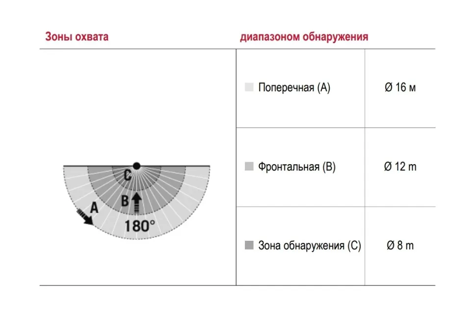 Угол обнаружения 180° в горизонтальной плоскости, 60° в вертикальной плоскости