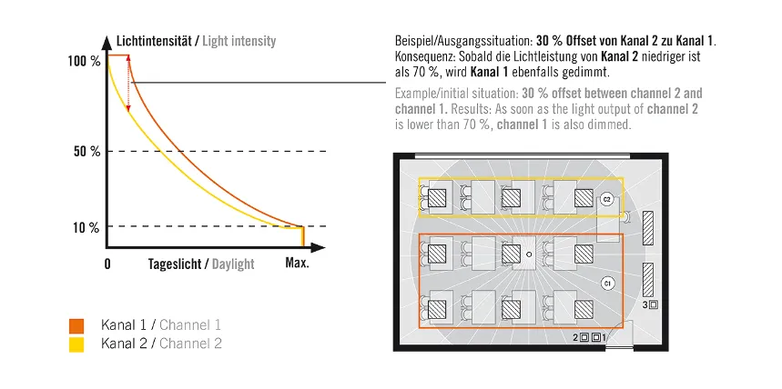 • Поддержание постоянного уровня освещенности в зависимости от присутствия людей и яркости дневного света