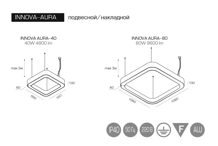 1 INNOVA AURA 80 блок питания TRIDONIC 80 Вт80 Вт 9600 Лм 3000K / 4000K / 5000 K 1100мм*1100мм*100мм (т:60мм)