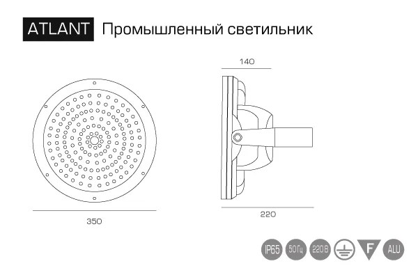 | 4 | ATLANT 100 | Асимметричная оптика 60°*140° | 100 Вт | 14500 Лм | 4000К / 5000K | d350 * 140мм (220мм - с учетом крепления) |