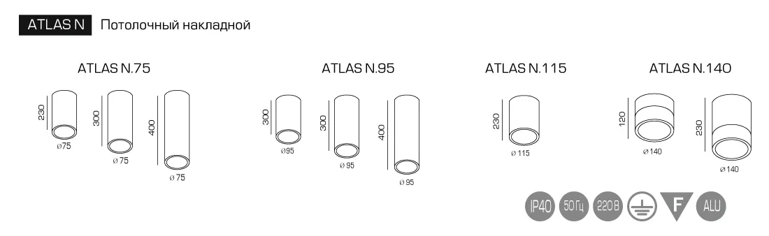 | 11 | ATLAS N95.230.15 | - | 15 Вт | 2600 Лм | 3000K / 4000K / 5000K | d95*230мм |