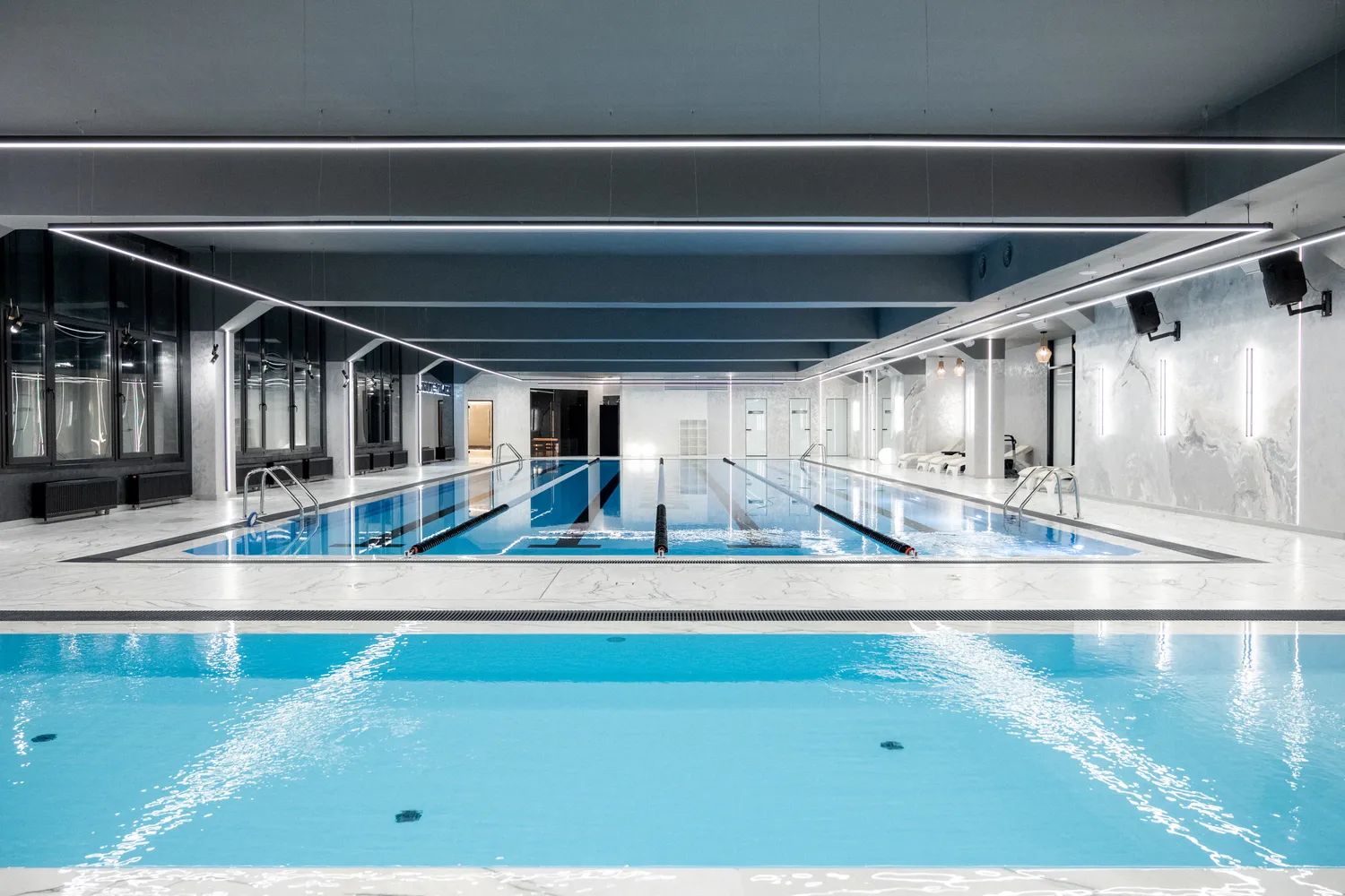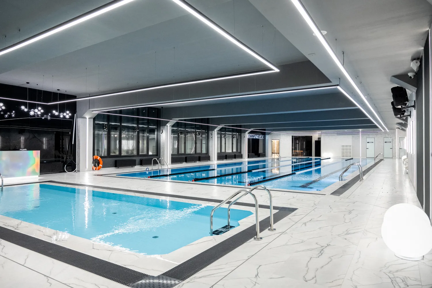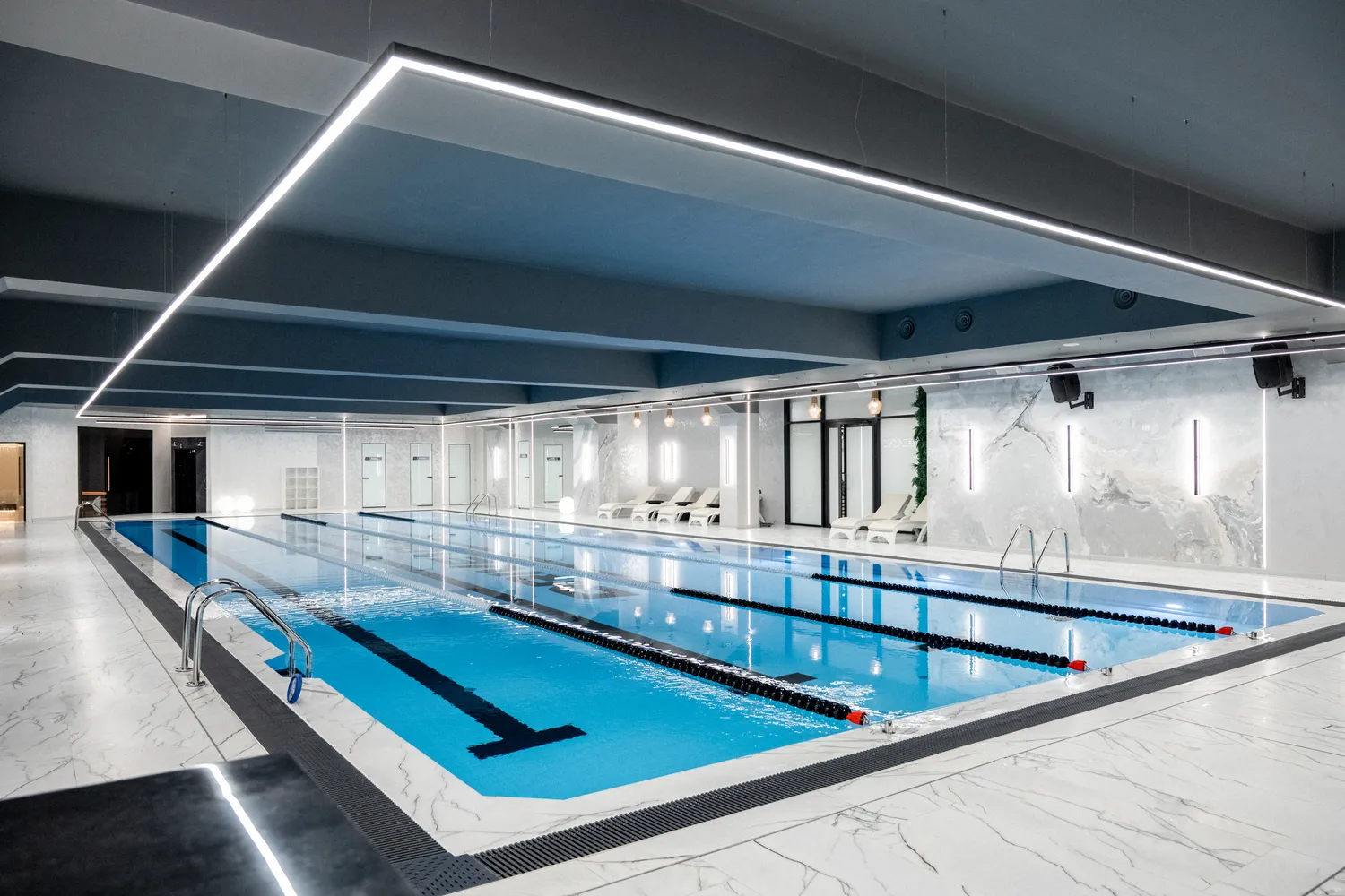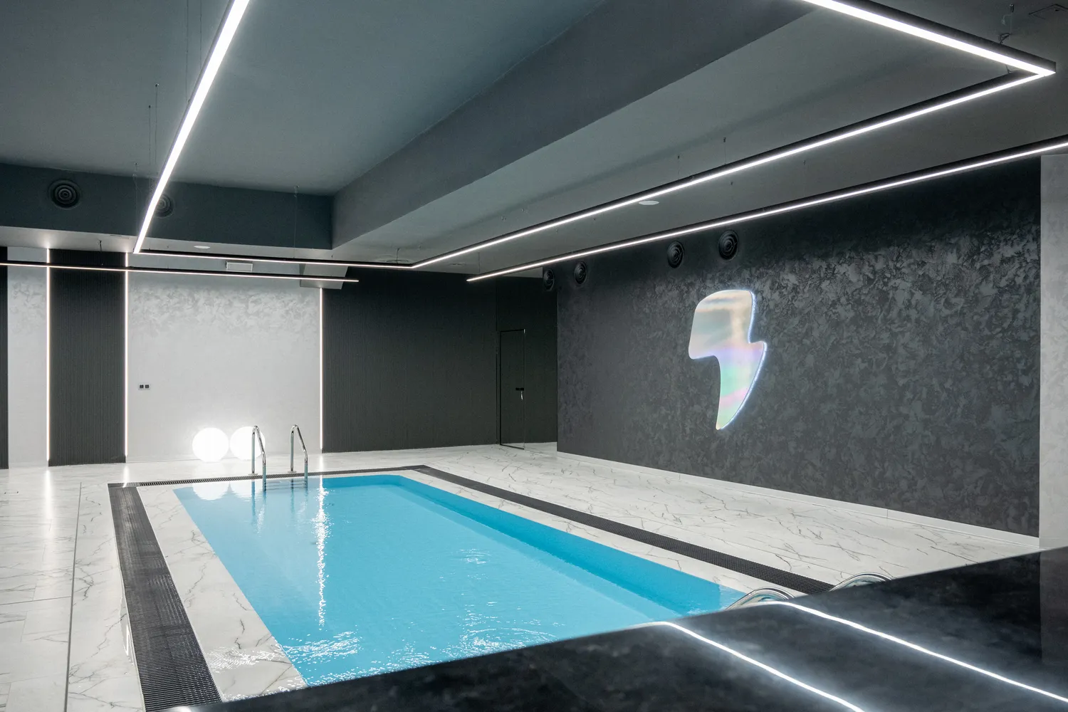 • Профильные светильники:  были выбраны в качестве основы системы освещения. Обеспечивают равномерный уровень освещенности и могут быть разной формы, цвета и мощности в зависимости от помещения. В этом проекте они присутствуют практически во всех помещениях , включая бассейн.