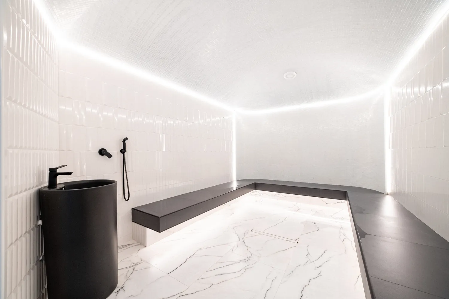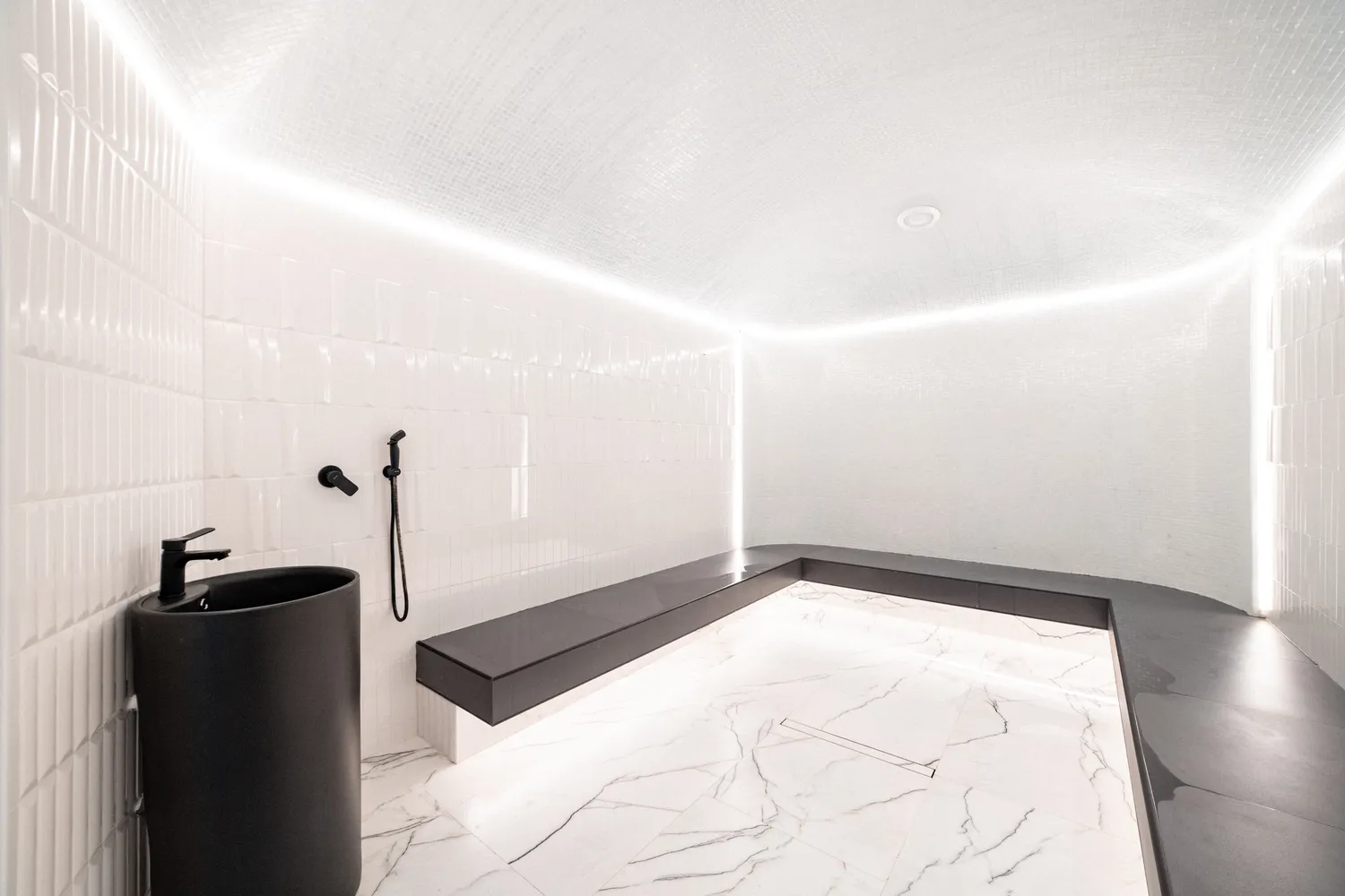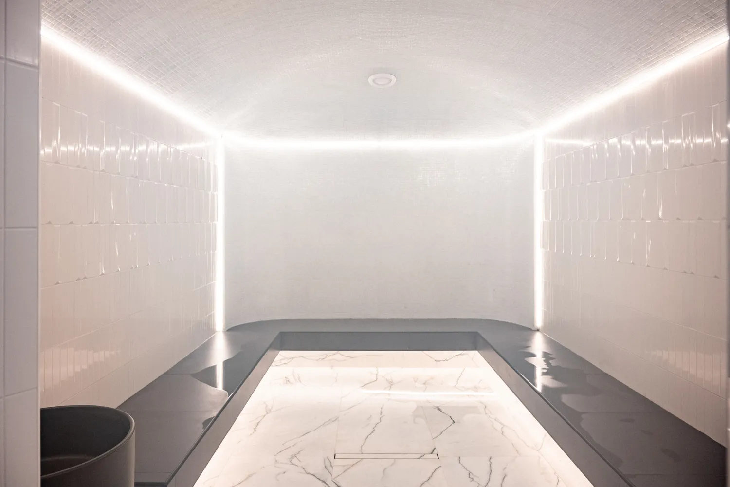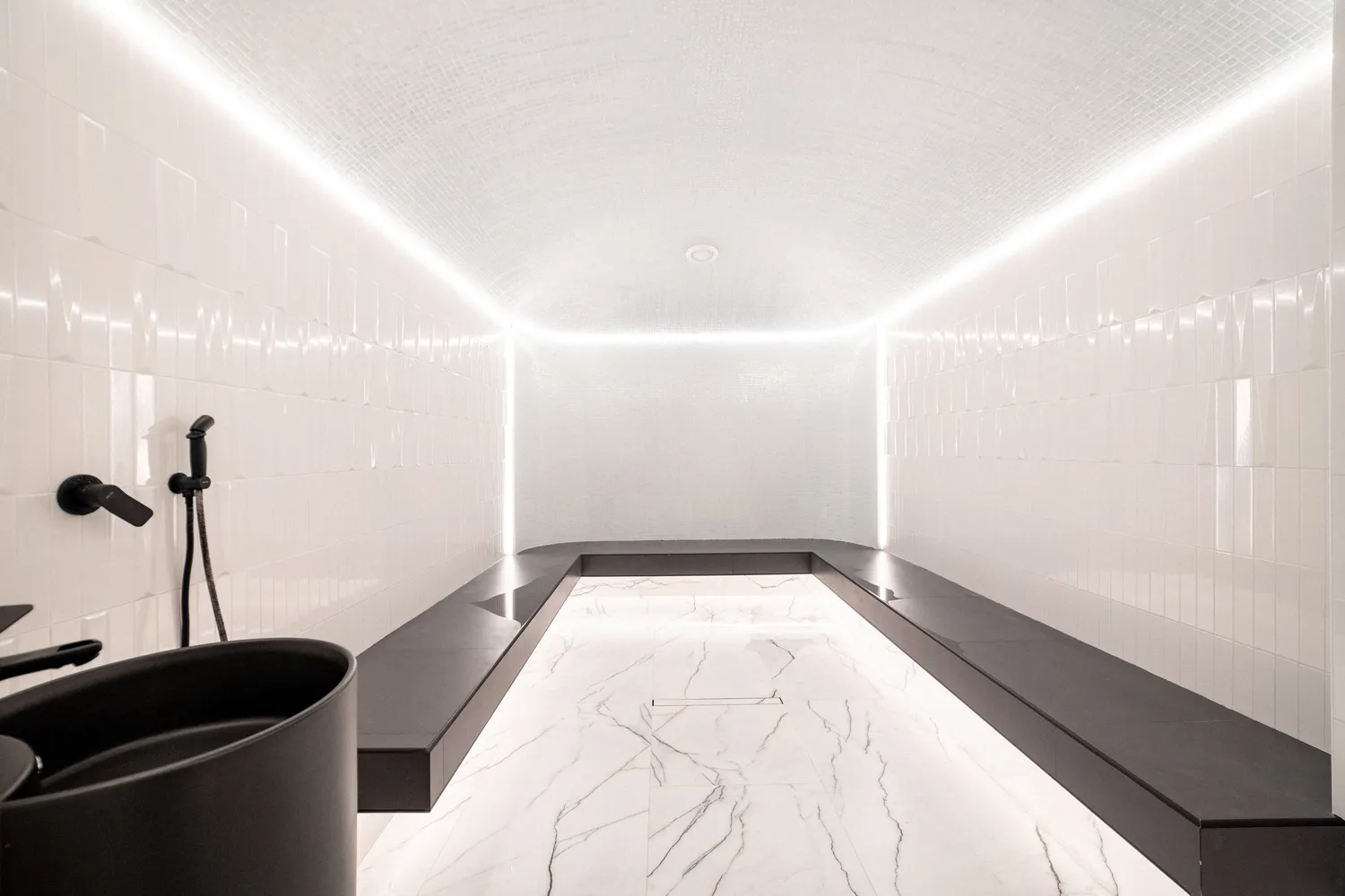 • Профильные светильники:  были выбраны в качестве основы системы освещения. Обеспечивают равномерный уровень освещенности и могут быть разной формы, цвета и мощности в зависимости от помещения. В этом проекте они присутствуют практически во всех помещениях , включая бассейн.