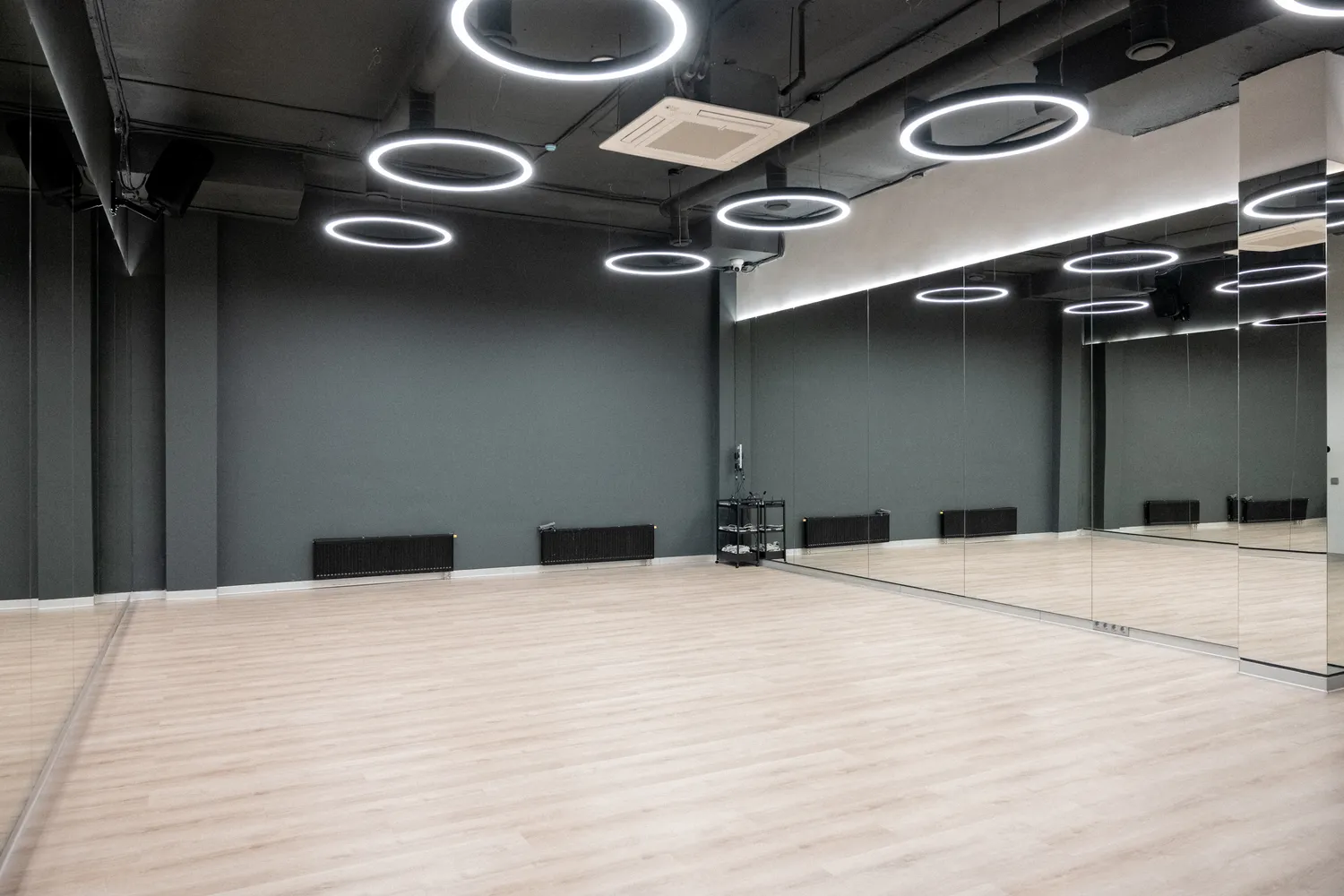 • Трековые светильники: крепятся к шинопроводу и позволяют легко перемещать светильники по потолку, что удобно для изменения направления света. Они были использованы для таких помещений как: рецепшн, зона единоборств,  тренажерный зал.