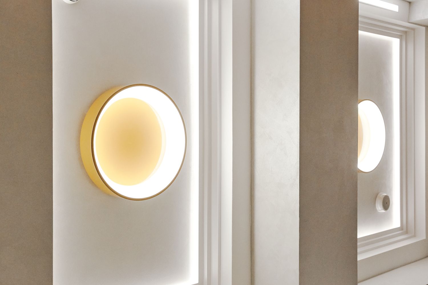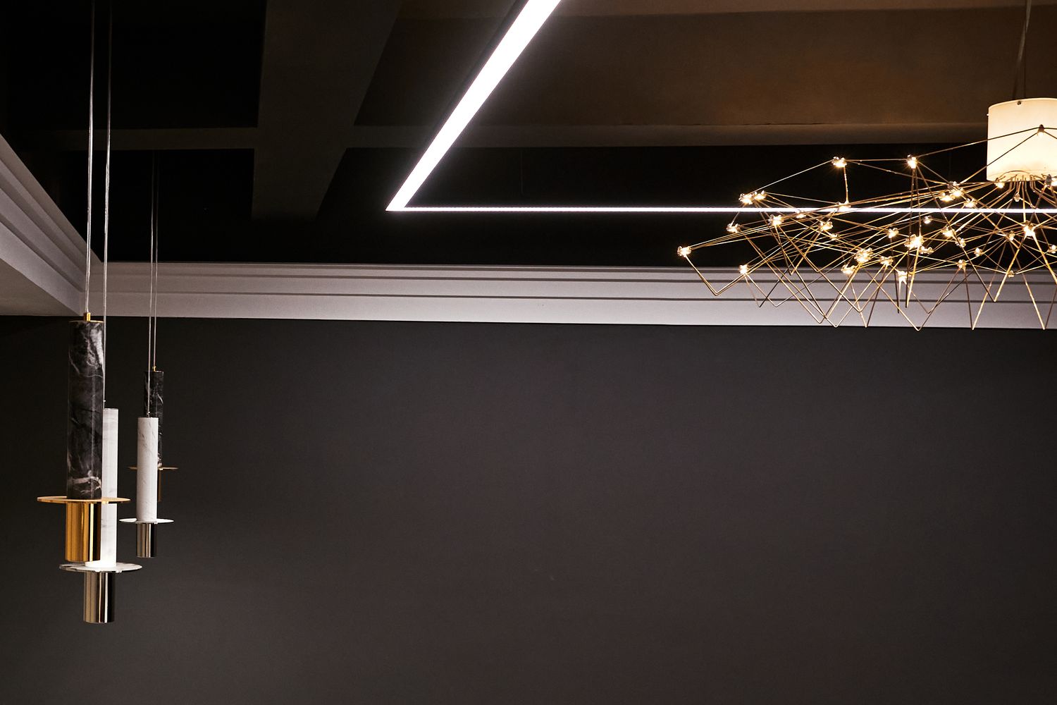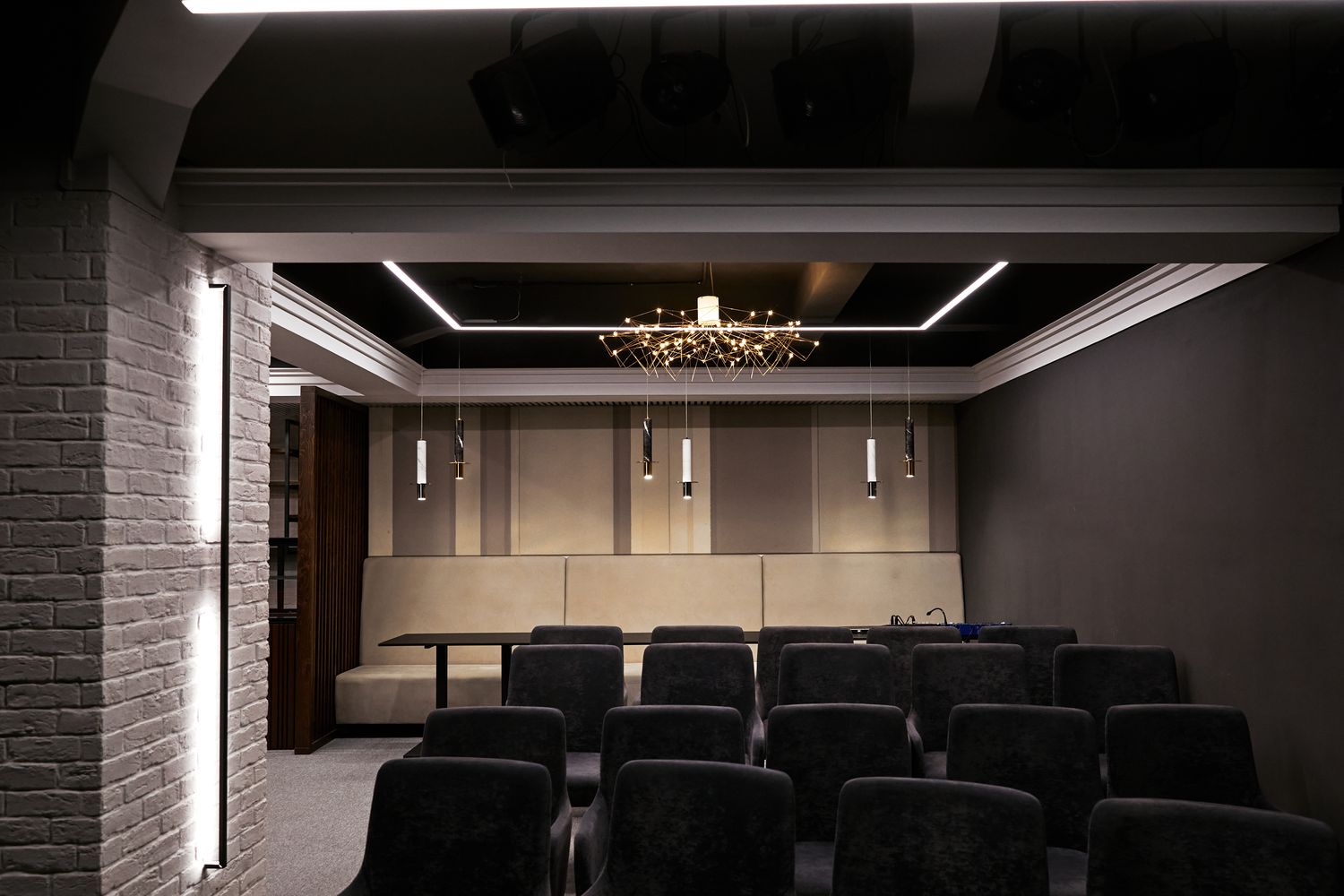 Свет играет большую роль в создании комфортного пространства. Линейные светильники отлично подошли для этого проекта. За счет световых линий на стенах в пространстве создается впечатляющий контраст темного помещения с яркими световыми полосами.